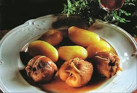 l’estofinado. Un plat composé de stockfish (cabillaud/morue ou églefin séché), pommes de terre, œufs, persil et huile de noix. On trouve aussi le nom estofi, littéralement « poisson bâton » en occitan, la morue (ou l’églefin) étant séchée et dure comme du bois.